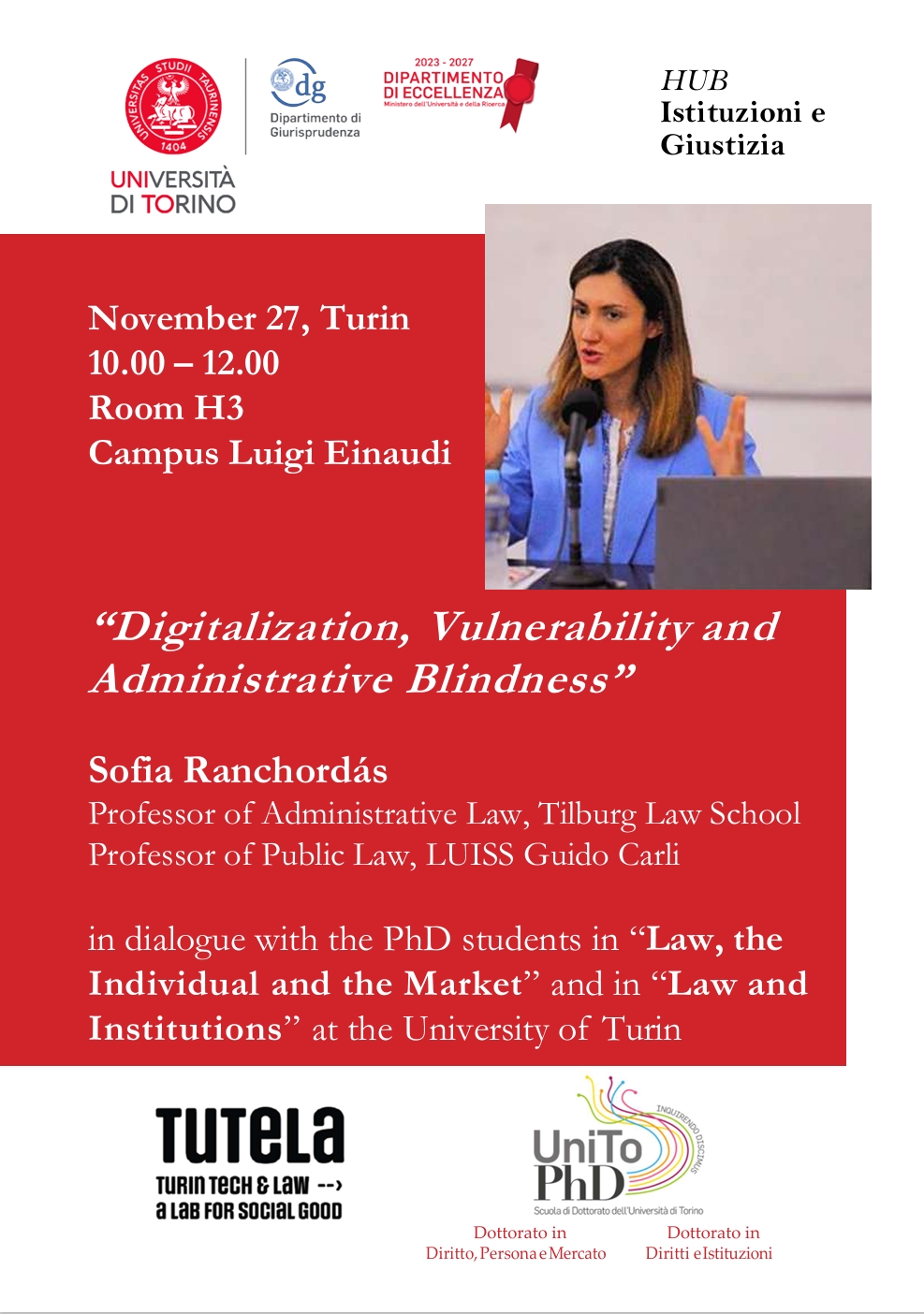 - 27/11, h. 10 – 12 (aula H3): Seminario Digitalization, Vulnerability and Administrative Blindness tenuto dalla Prof.ssa Sofia Ranchordás, in dialogo con i dottorandi dei Corsi di dottorato in Diritto, Persona e Mercato e Diritti e Istituzioni per discutere dei singoli progetti di ricerca, con particolare attenzione ai temi della digitalizzazione e della vulnerabilità.